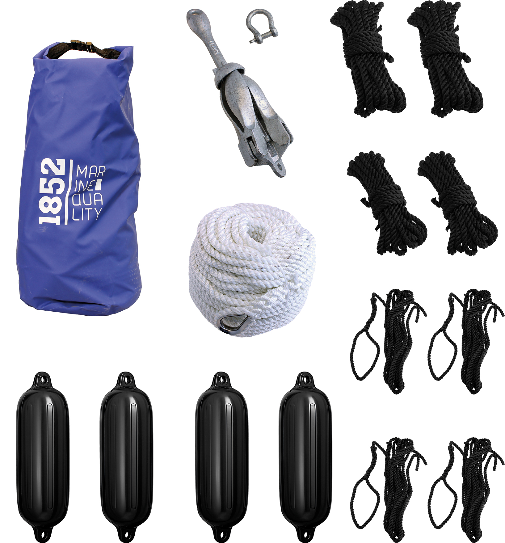 Komplett fortøyningspakke fra 1852 i vanntett bag. Velg liten (opptil 12 fot) eller stor (opptil 16 fot). Inkluderer fortøyningstau, ankerline, dregg, fendere og mer. Enkel og sikker fortøyning!