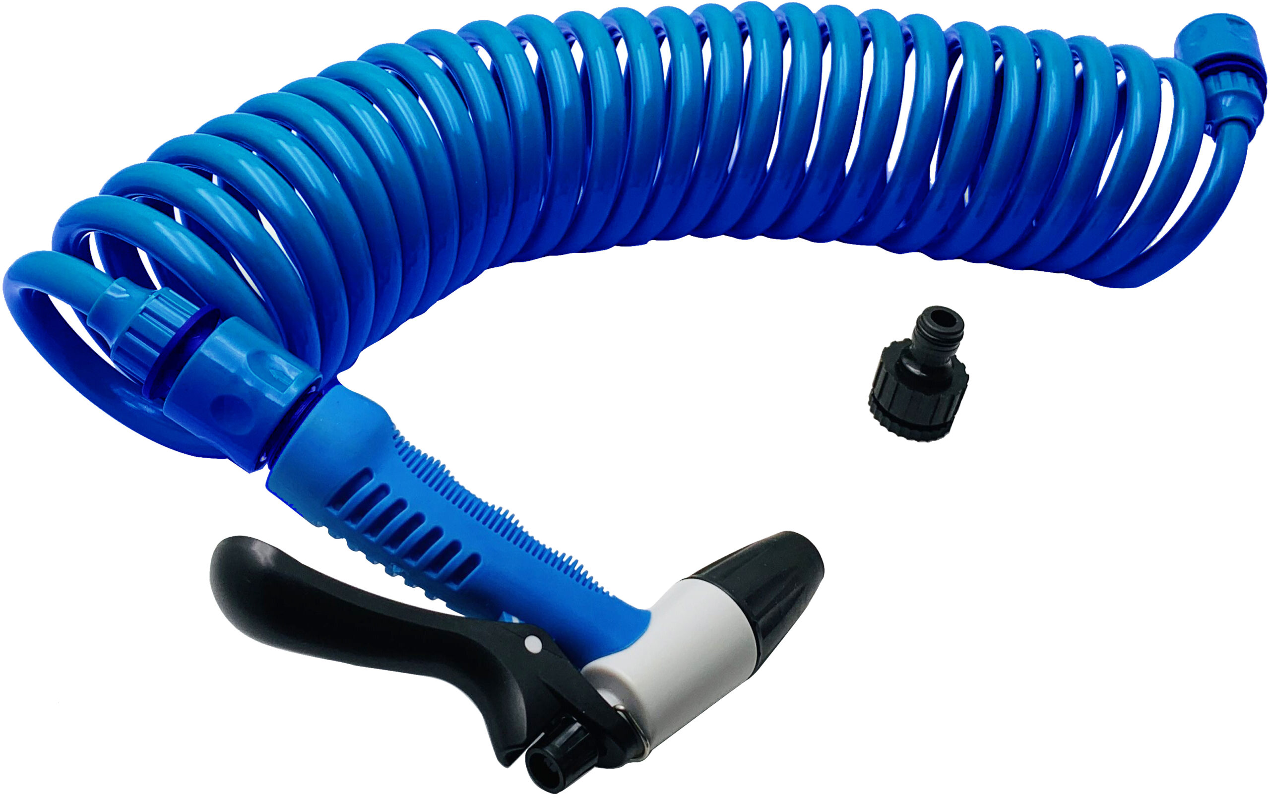 Komplett spyleslange kit med spiralslange (ca. 7m), spylepistol, bag og koblinger. Enkel å pakke sammen (ca. 40cm) for praktisk oppbevaring. Perfekt for båtvask!