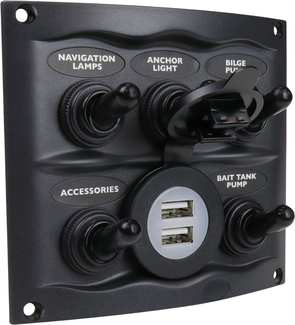 Kompakt og sprutsikkert BEP bryterpanel med 5 brytere og dobbel USB-uttak. Perfekt for enkel kontroll og lading om bord. Leveres med sikringer. IP65-klassifisert.