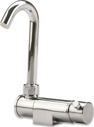 Stilig og plassbesparende blandebatteri i forkrommet messing med nedfellbar tut. Perfekt for båt, bobil og hytte. Leveres komplett med slangetilkoblinger for enkel montering.