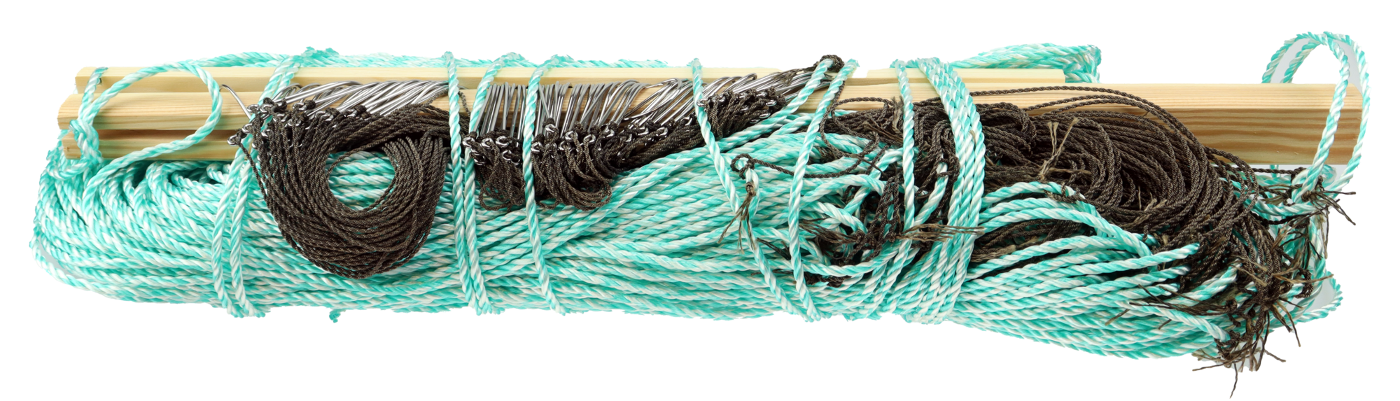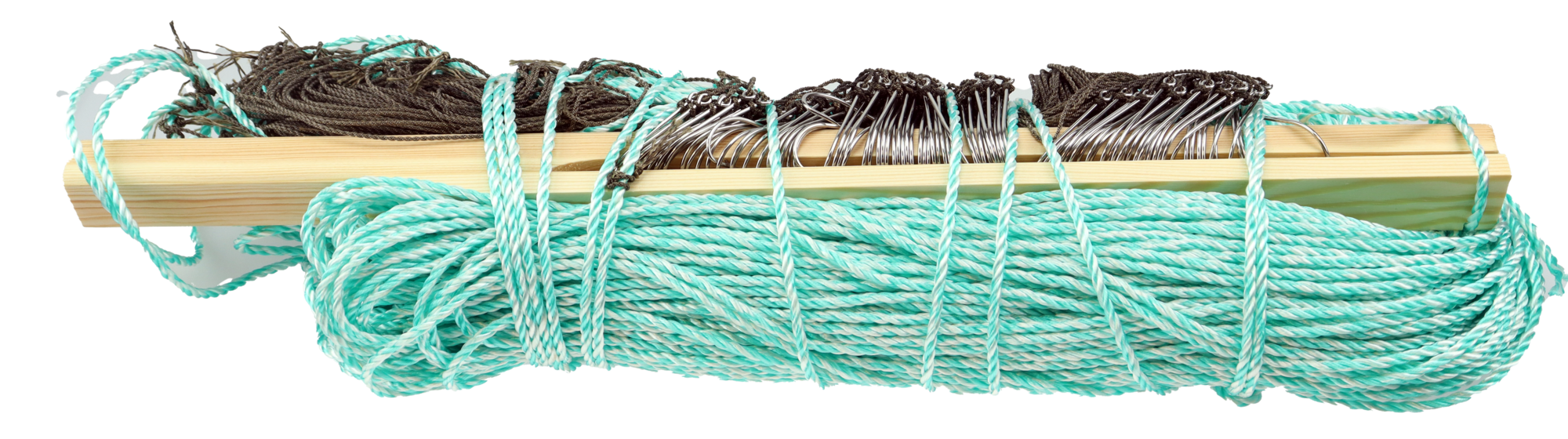 Bakkelinen består av rustfrie linekroker Mustad 34007 i str 4/0m avstand ca 1,8 meter mellom krokene. Linen er ca 3mm tykk. BRUKSANVISNING FOR LINEFISKEBakkeline er et svært enkelt, morsomt og effektivt redskap i bruk.Linen består av en hovedline påmontert forsyn og kroker. Du agner med det du har for hånden: makrell, sildebiter, reker, snegler, blåskjell og lignende. I utgangspunktet ligger linen på bunnen, men ved å feste et flyte- og synkeelement på hver 10. Krok får man linen til å flyte opp. Man kan bruke line på alle dybder, men redskapen er mest effektiv på noe dypere vann. Fra 20m og nedover. Linefiske kan utføres like effektivt hele året, men om sommeren er det normalt mest effektivt å fiske på dybder over 40m:Eksempler på bruksmåter:Fest i land med Iletau og stein i andre enden. Man bør bruke noe tau/snøre inne ved land, slik at settingen begynner på en viss dybde. Ile i begge ender. Når du starter settingen begynn med å slippe ut den ene blåsen med båten i fart. Vær sikker på at du har nok line til å nå bunnen. Første Ile kan godt være med spinkelt redskap og fungerer som en reserve dersom den andre skulle bli kuttet av båter eller lignende. Flyteelement på eksempel hver 10. Krok. Bruk også bunnstein med samme avstand. Linen kan settes sent om kvelden og trekkes tidlig om morgenen. Eller den kan settes tidlig om morgenen og trekkes 2-3 timer senere. Dagsett kan også være effektivt, men da bør ettermiddag og Kveld benyttes. Linen bør settes på noenlunde slett bunn.