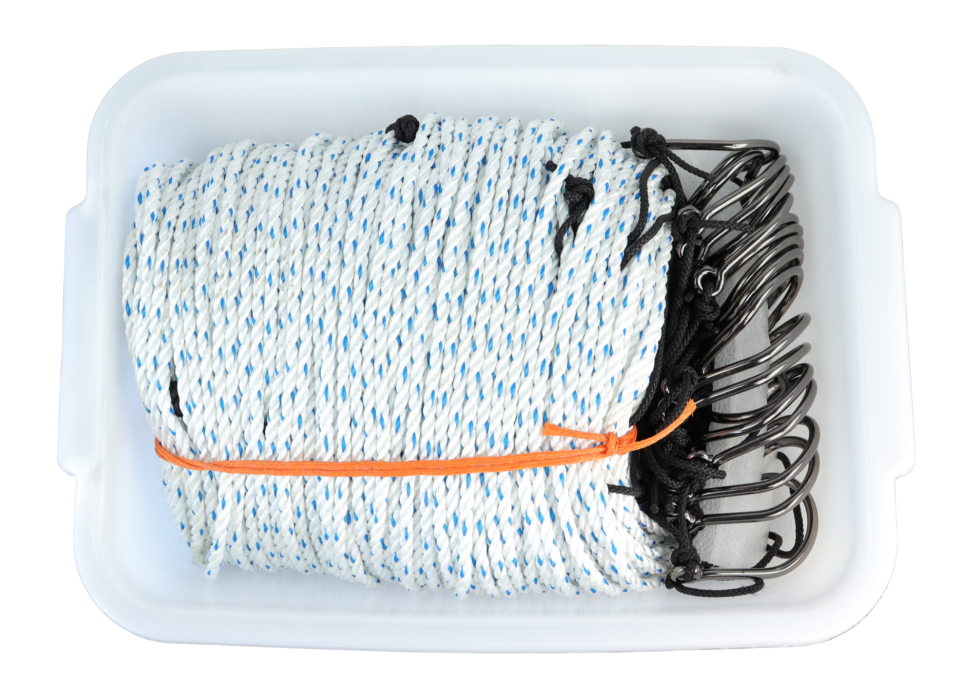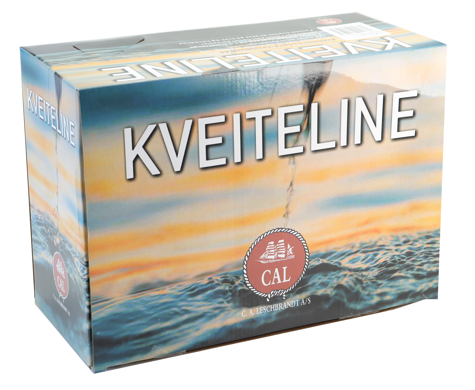 Kveiteline fra CAL. Oppgradert kveiteline med 20 stk kroker 399665D 16/0 180 meter 5mm synketau. 9 meter mellom krokene, og 1,2 meter langer fortommer i 3mm sort flettet polyester. Fortom knyttet direkte på krok og hovedline. Kommer i praktisk oppbevaringsboks. Bruk. Settes direkte fra plastboksen, eller plasser linen i en rund dunk, kveiles ned med krokene ytterst i dunken. Som agn passer en halv makrell eller sild. Bruk solid synk og ha tilstrekkelig med tauverk. Som flottør brukes flaggmann eller stor flottør. Ha gjerne opphaler i begge ender. Husk å merke flottør med navn, adresse og mobilnr. Etter bruk bør kroker renses og påføres fett, og det hele lagres ”musefritt”.