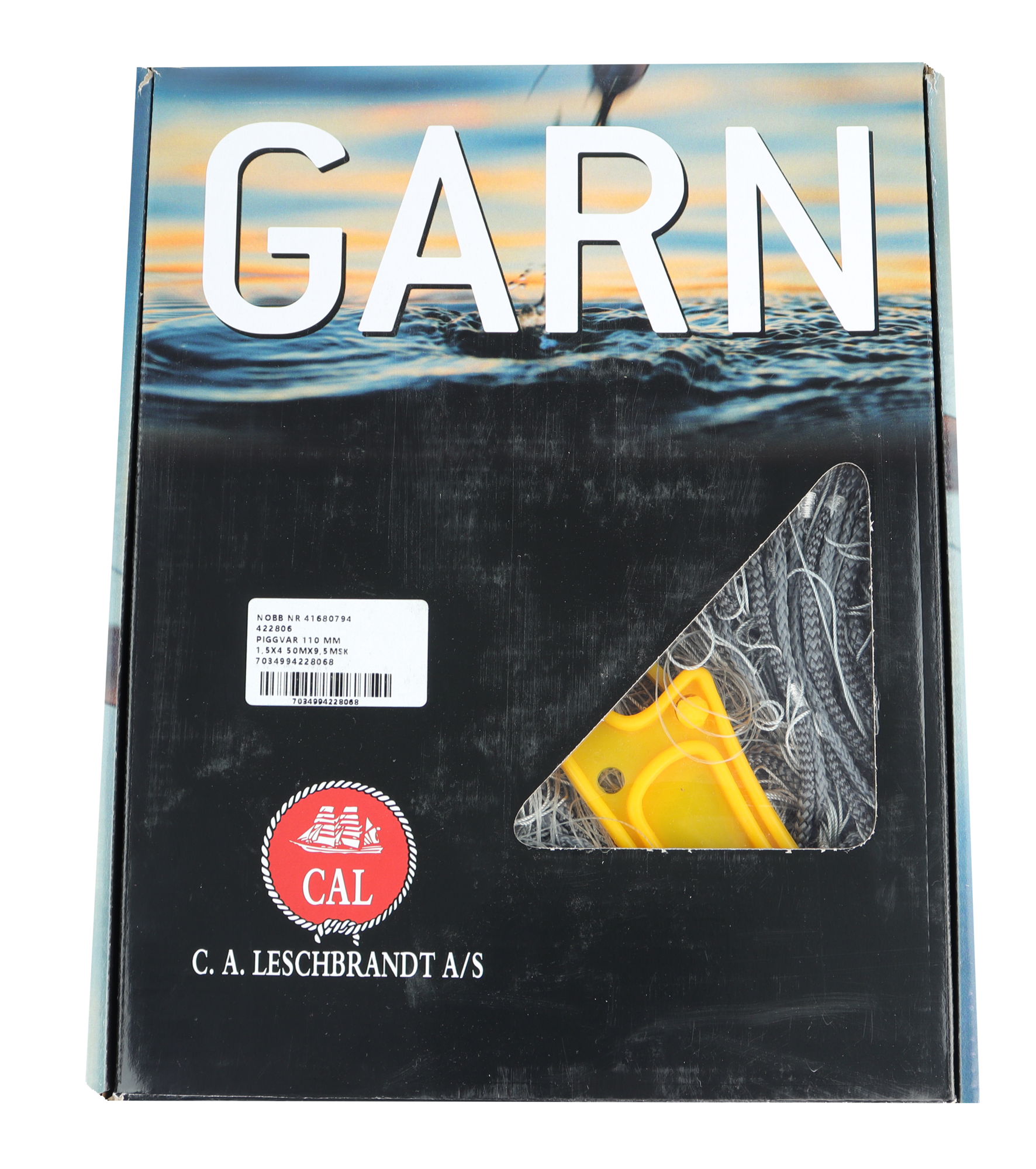 PIGGVARGARN Maskinmontert med korkeline 4/40 + 3mm PP flat line oppe. Blyfri synkeline 3kg/100m. ved bunn. Lengde 50 mtr. Dybde ca. 2 meter.Brøstning 3mm PP flat line.Garnet er innmontert til 1/3 lengde, som gir en meget god fiskeevne.