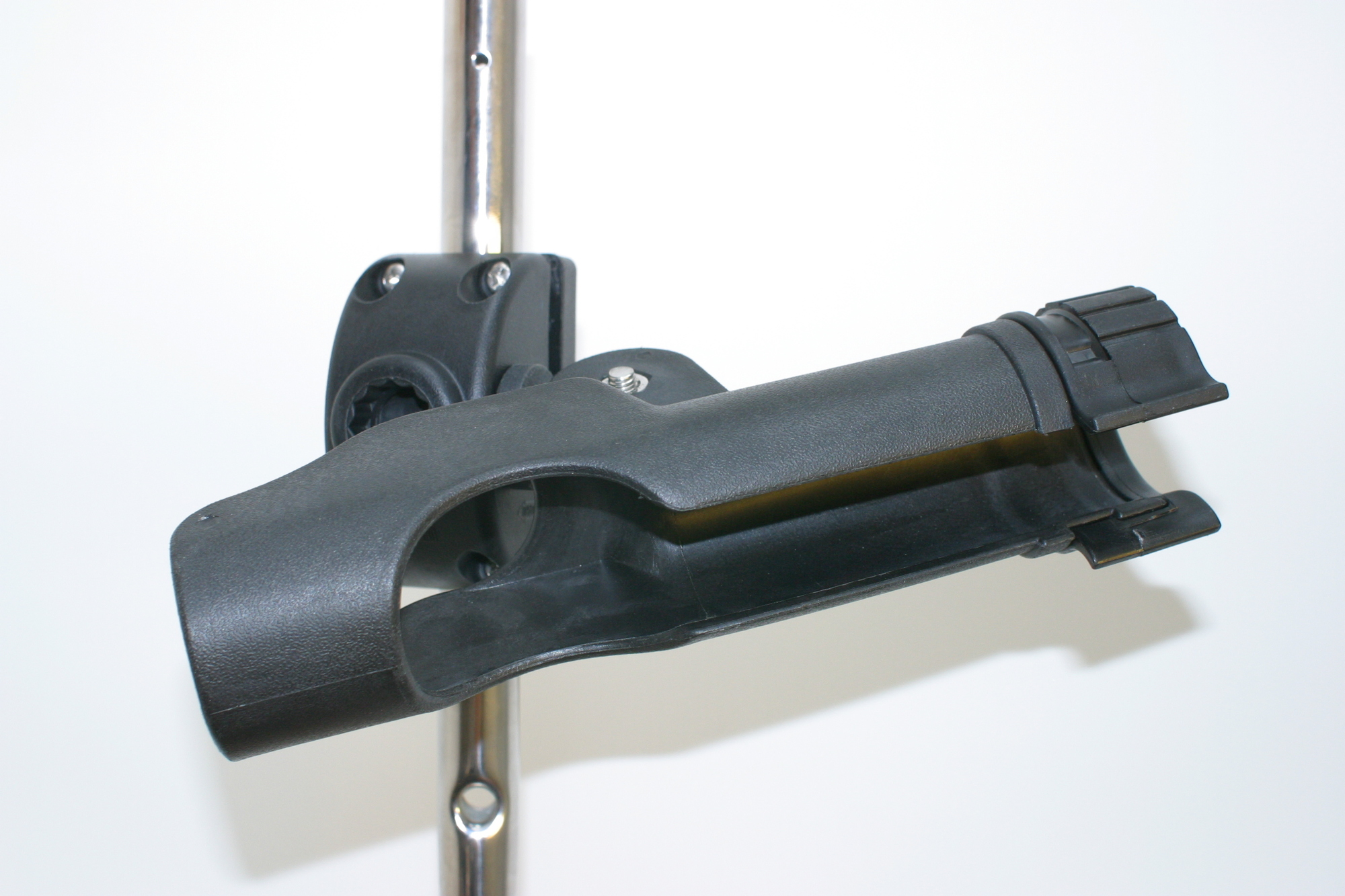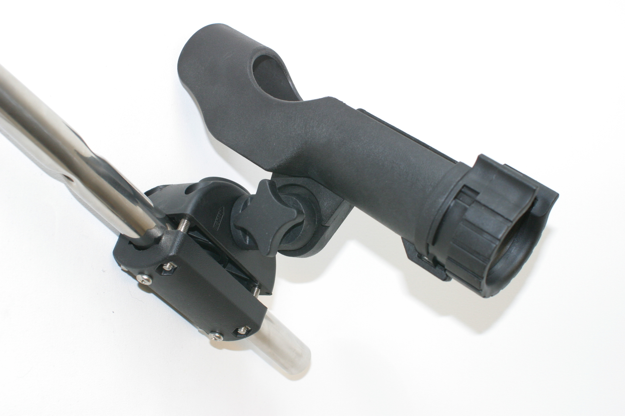 Kraftig og solid stangholder. Leveres med brakett for rekkefeste (25mm). Kan også sidemonteres (skott) og toppmonteres (dekk og topprekke)Justerbar vinkel og rotasjon.Sort plast.
