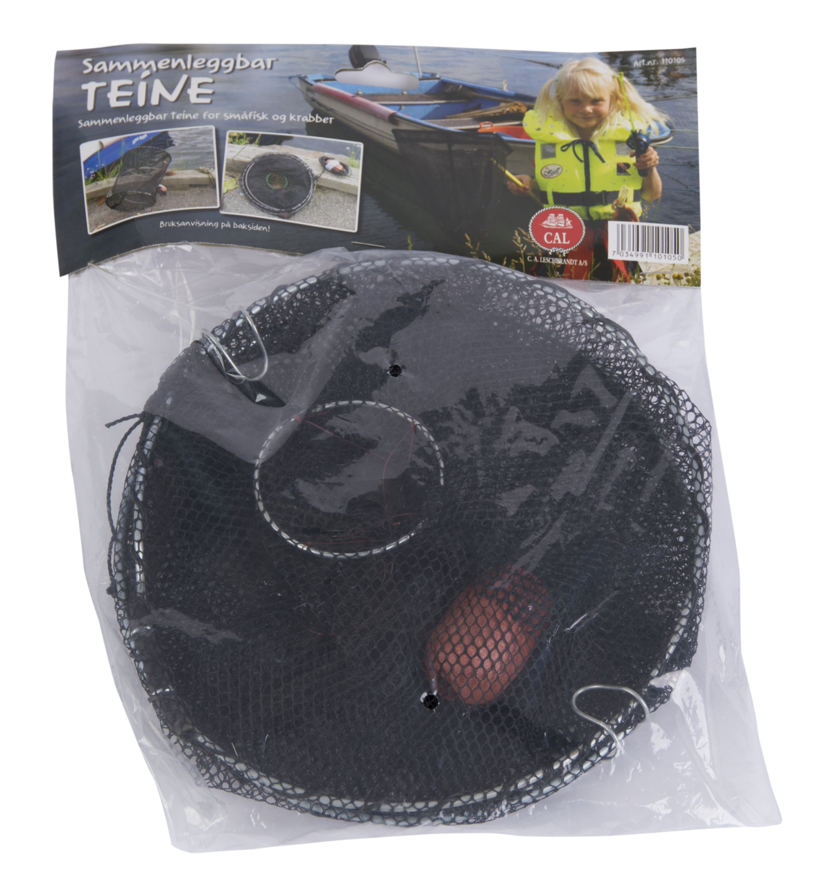 Teine for barn. Teinen åpnes ved å løsne de to stålklemmene. Som agn brukes knust blåskjell, muslinger eller fiskeavfall. Teinen er utstyrt med opphaler og flottør. La den stå i ro på bunnen en tid før den etterses, gjerne over natten.