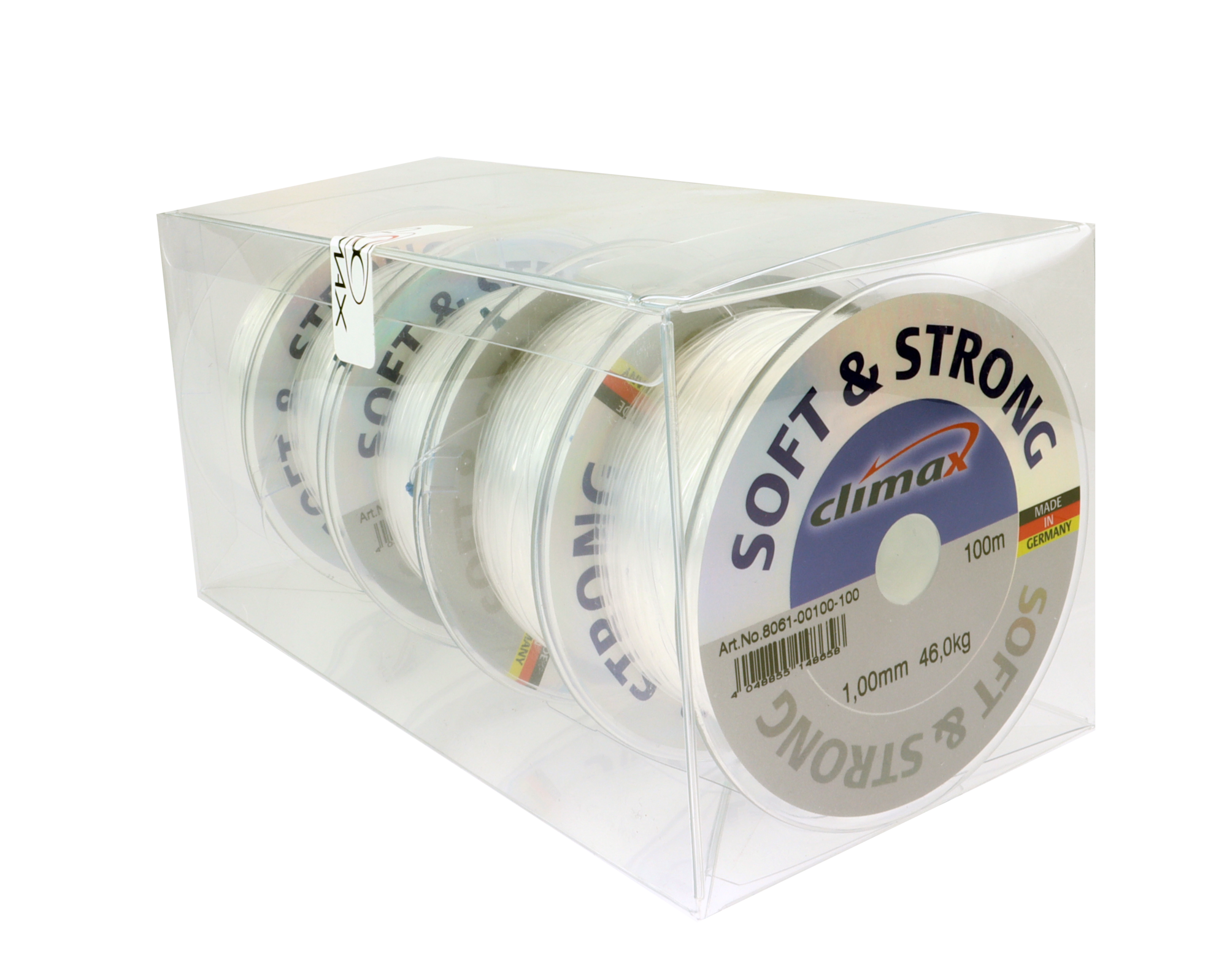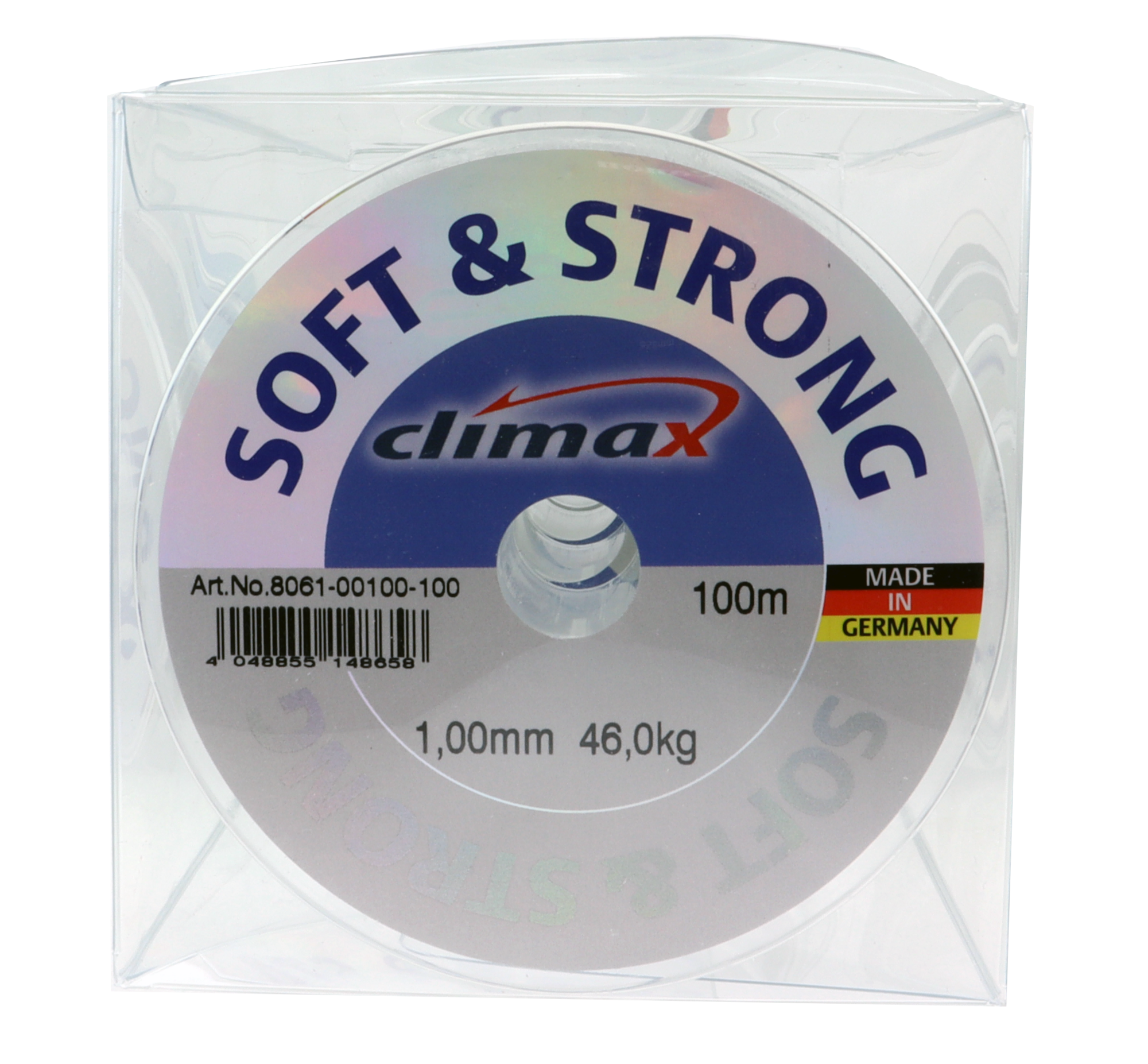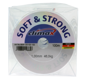 Climax Soft & Strong er en sterk allround monofilament sene, egnet for både ferskvann og sjøfiske. Finnes i dim. 0,50-1,40mm. 5x100m spole i eske. Katalogpris pris pr. eske à 5 stk Veil pris oppgitt PR. SPOLE!
