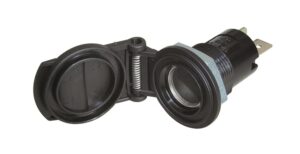 Sikkert og robust DIN 12/24V uttak for innfelling med fjærlokk. Ideell for båt, bil og campingvogn. Maks 16A, ISO4165 og TUV-godkjent. Enkel installasjon med 18mm monteringshull.