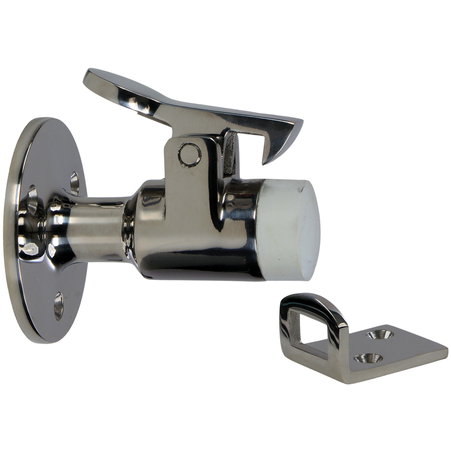 Solid hvit dørholder i høyglanspolert rustfritt stål med 90° låsemekanisme.