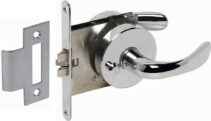 Solid Razeto dørlås i forkrommet messing for båt. Komplett sett med låsekasse, dørskilt og vrider. Sikkerhet og stil for din lugar! Låsekassen måler 66 x 56 mm.
