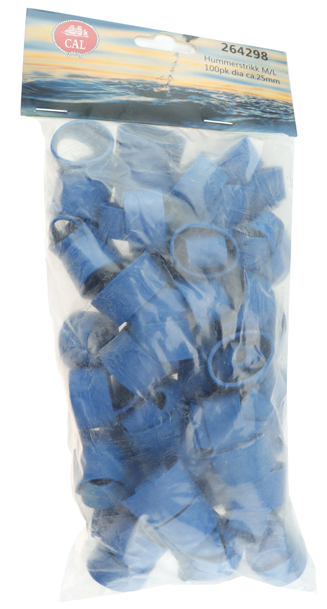 Gummiststrikk til å feste rundt klørne på hummer i stedet for messingtråd.Festes med hummertang 264296Medium/large: dia.ca.25mm+) 100pkFarge: Blå
