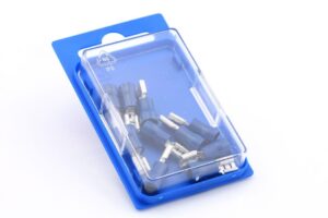 Innhold: 10 stk blå, vinylisolerte kabelsko (flatstift 4.8×0.5mm) i blisterpakning.