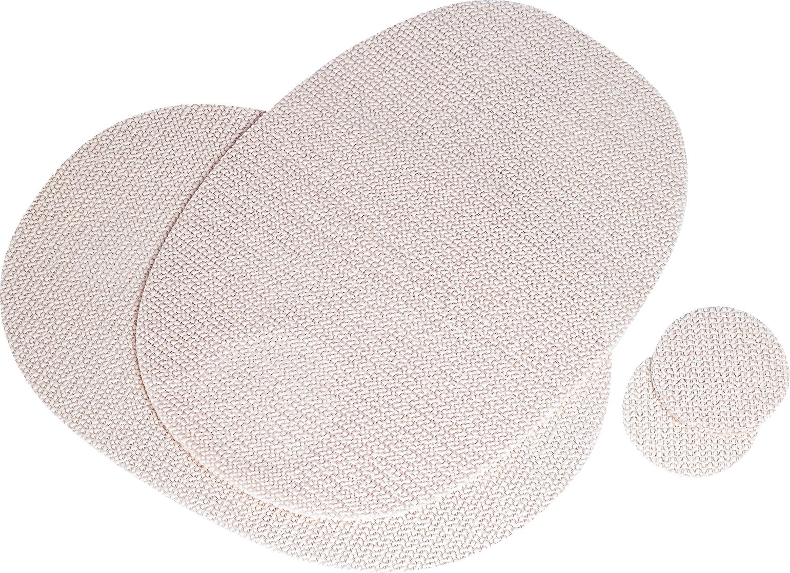 Settet består av to forskjellige størrelser: fire brikker til dekketøy som måler 45 x 31 cm, og fire mindre brikker med en diameter på 10 cm, ideelle for glass. Dette sikrer at hele borddekkingen din er beskyttet og ser flott ut.