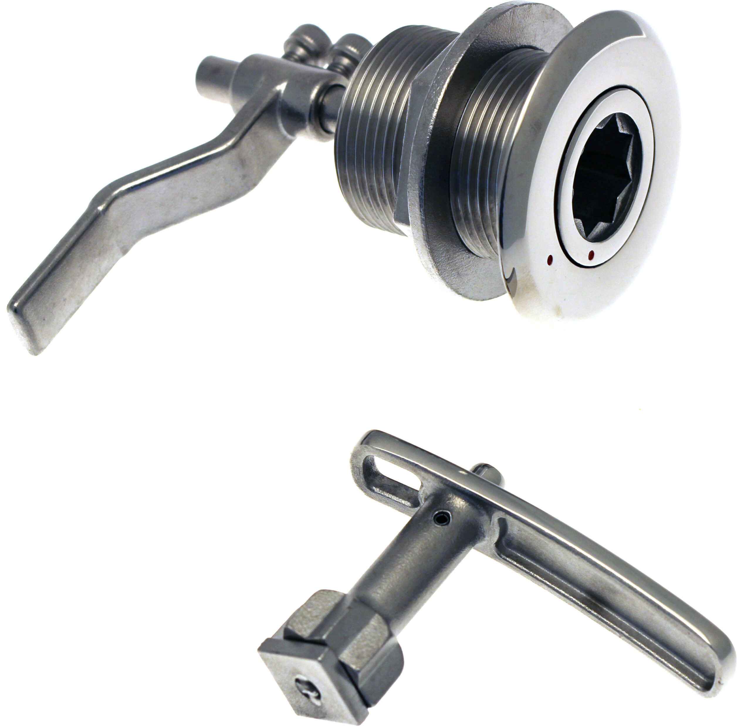 Solid lukelås i syrefast stål med strammefunksjon for sikker lukking. Flens Ø: 65 mm. Medfølgende nøkkel med håndtak. Perfekt for båt og maritimt bruk.
