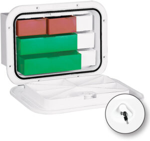 Oppbevaringsboksen leveres med et låsbart lokk som sikrer innholdet underveis. Dette er spesielt nyttig i røff sjø eller når båten ligger for anker. Du kan være trygg på at tingene dine holder seg på plass.