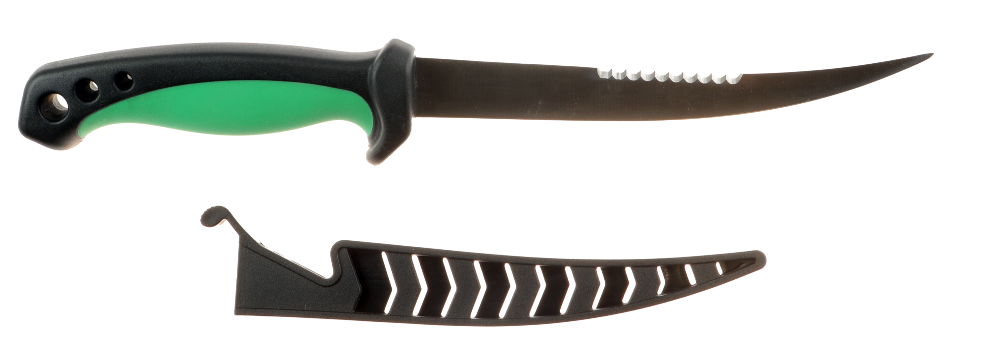 Myk, lett og fleksibel filetkniv med behagelig grep. Laget i 1,8mm blankt 3CR13 stål, som er meget lett å skjerpe.Kniven har et felt med serratering på overside og kraftig krumming på spissen av bladet. Leveres med ribbet plastslire. Total lengde 29cmBlad 16cmVekt m/slire: 90grMed øye i enden så man enkelt kan feste et rep eller en flytedobbe til kniven. NB! Selges kun i hele bøtter à 30 stk. Pris pr stk!