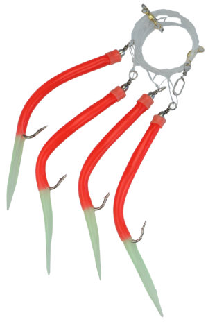 OSEAN Kroksett med 4 røde gummimakk 6/0 m/fluoriserende tuppSene: 0,70mm30 cm mellom krokeneTotal lengde: 150cmEgnet for fiske etter bla. sei, lyr og torsk Leveres med svivel i topp og bunn, samt snapsvivel for enkel montering.