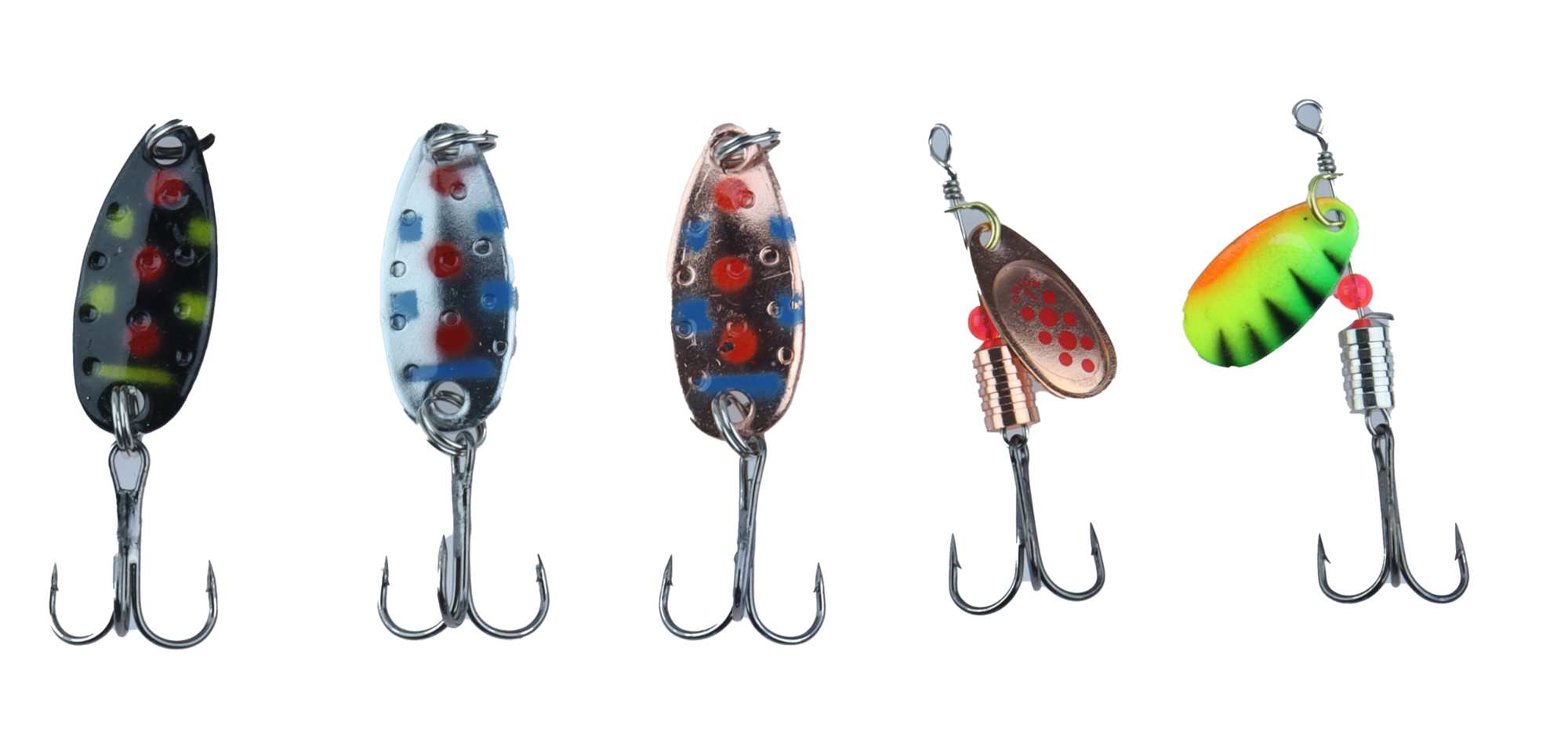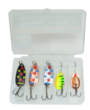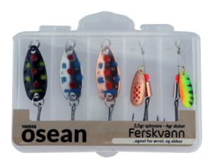 Osean sluksett for lett fiske i ferskvannBestår av 3 ass ørretsluker 4 gr og 2 stk #1 spinnere 3,5gr Leveres i slukboks 5 rom, med oppheng for pigg.