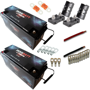 Oppgrader ditt elektriske system med denne komplette pakken bestående av to Skanbatt Lithium Heat 51,2V 50Ah batterier, tilpasset kabling og nødvendige sikringer. Denne pakken gir deg en pålitelig og kraftig energiløsning, ideell for båter, hytter og andre applikasjoner som krever stabil strømforsyning.