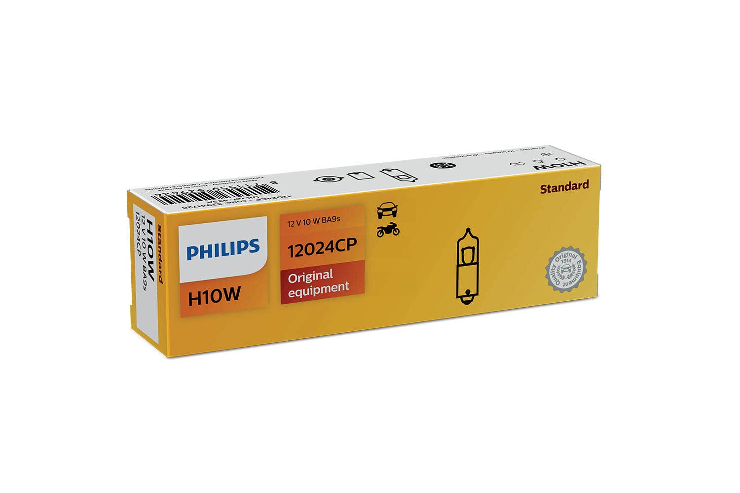 Philips H10W halogenpære 10-pakning: Pålitelig miniatyrpære (12V, 2000K) for bilen. Praktisk reserve, lang levetid, enkel installasjon.