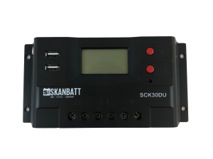 Effektiv og prisgunstig SKANBATT solcelleregulator PWM 30A med LCD-display. Passer de fleste batterityper og solcellepanel. Justerbare ladeparametre og USB-uttak.
