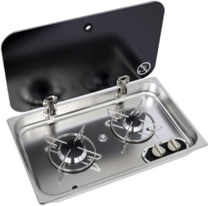 Elegant og praktisk 2-brenner gasskoketopp for båt med glassplate og termisk sikring. Perfekt for matlaging på sjøen! Kraftig 2,8 kW brenner.