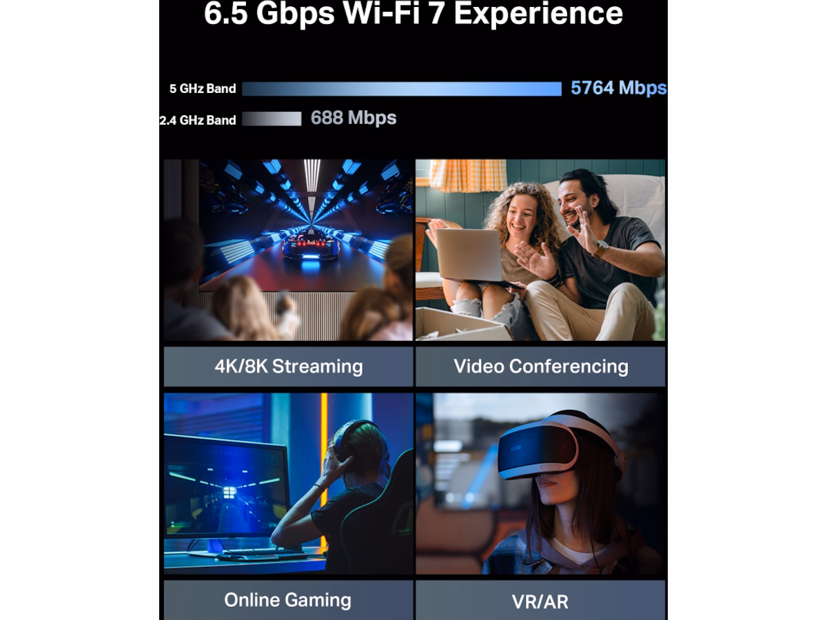 Denne ruteren støtter alle Wi-Fi-generasjoner og enheter (802.11a/b/g/n/ac/ax/be) og fungerer med alle internettleverandører. Gjør overgangen til neste generasjons WiFi 7 enkel og trygg.