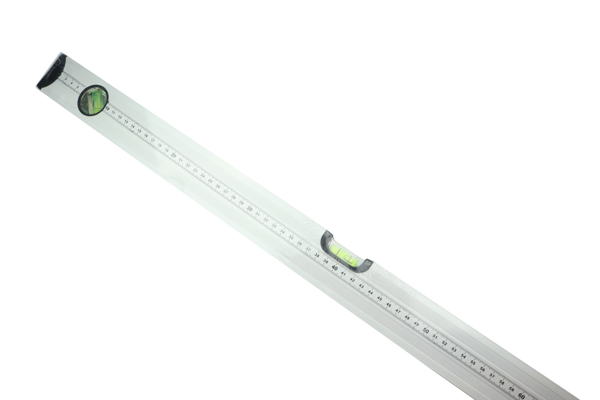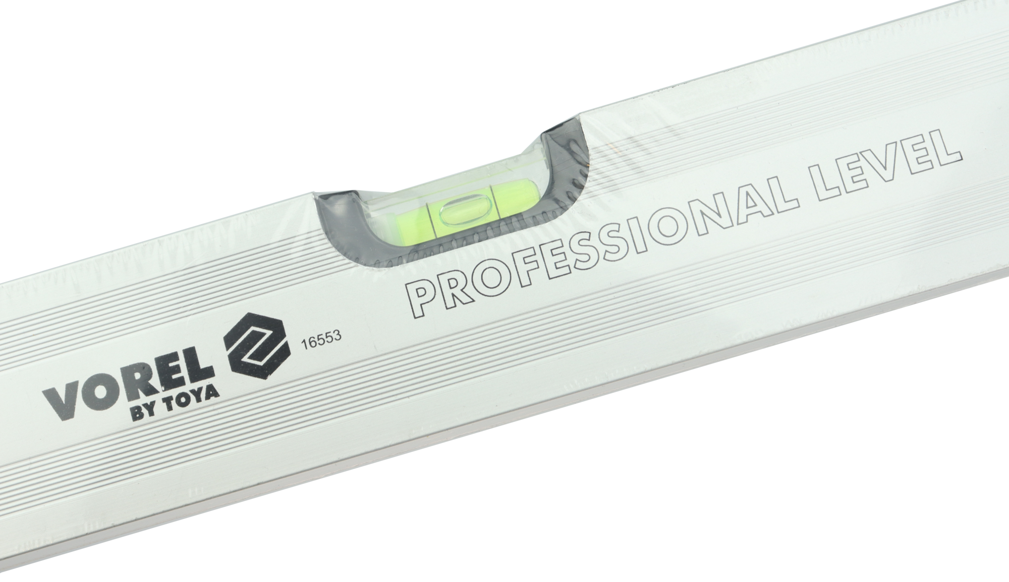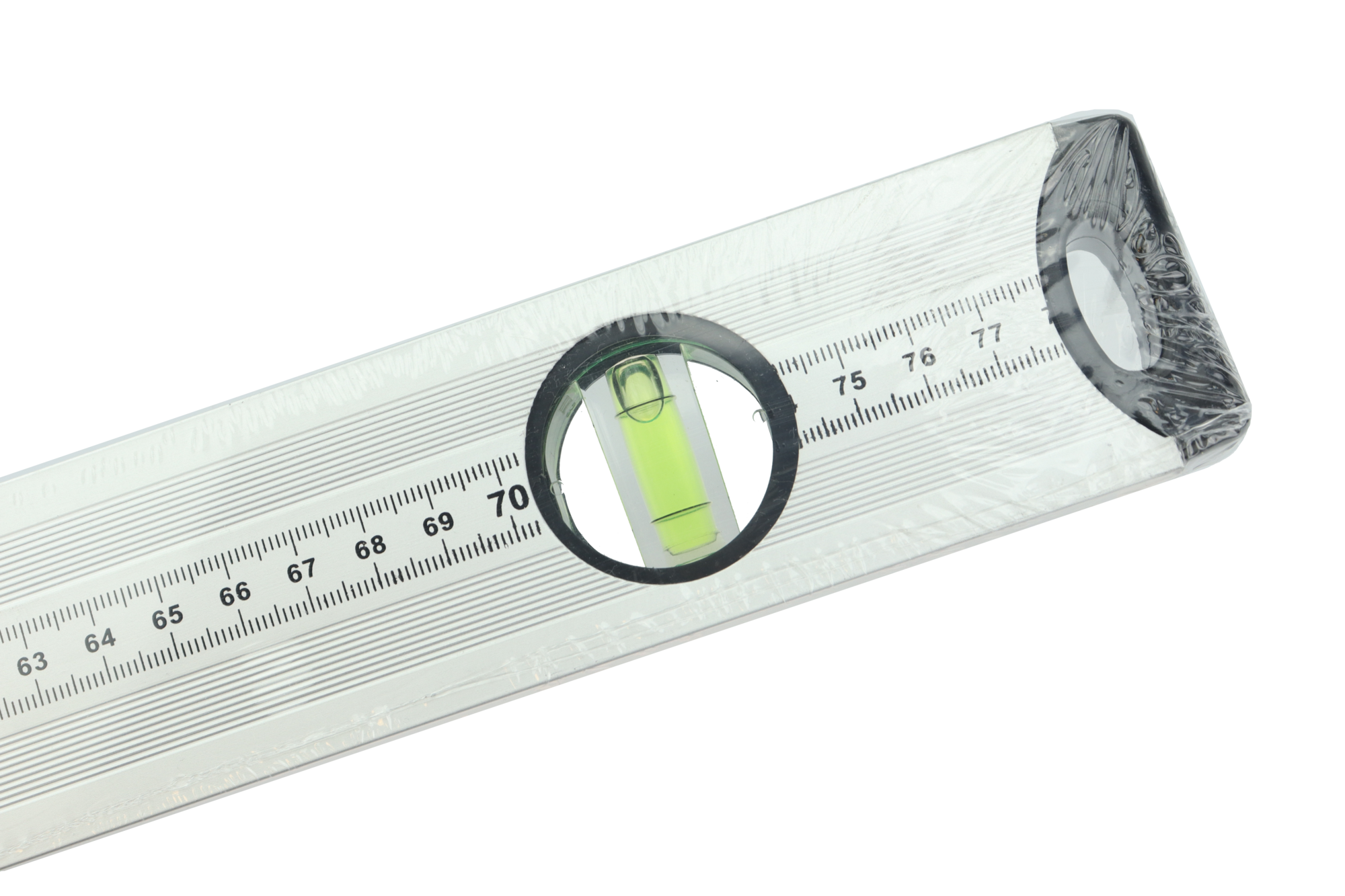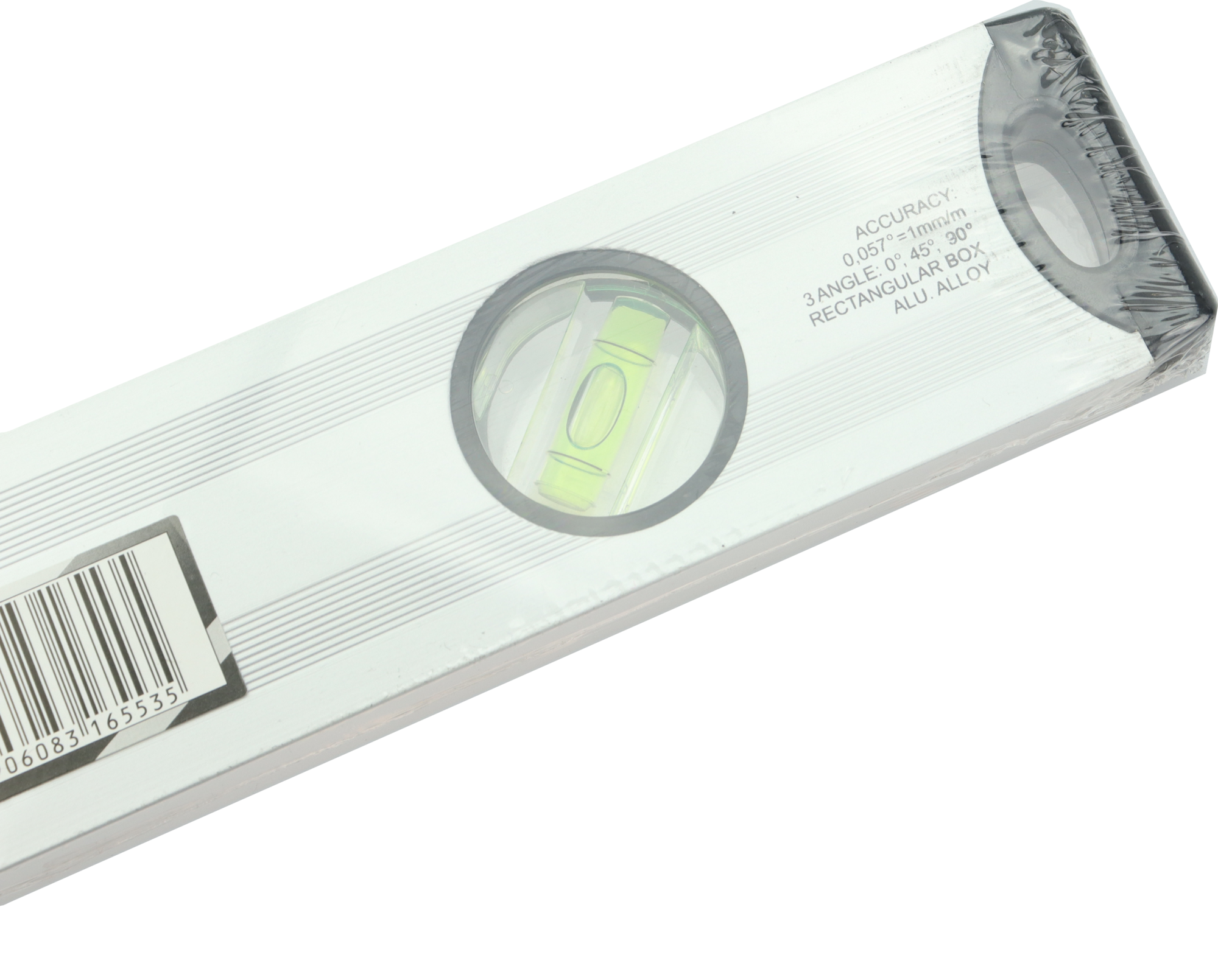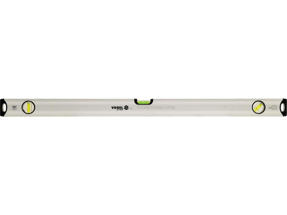 Kvalitetsvater laget i anodisert aluminium. Lengde: 800mm3 libeller, 0°, 45° og 90°. Uknuselig glass. Nøyaktighet: 0,057° – 1mm/mMåleskala i cm på toppen av vateret.