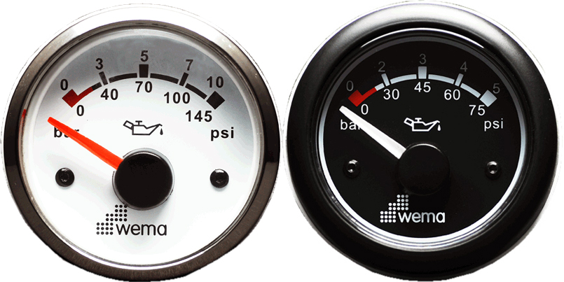 Overvåk oljetrykket med Wema oljetrykksmåler! Vanntett, UV-bestandig og enkel å installere. Silverline-serien med syrefast stål. Passer 12/24V. Ø: 52mm.