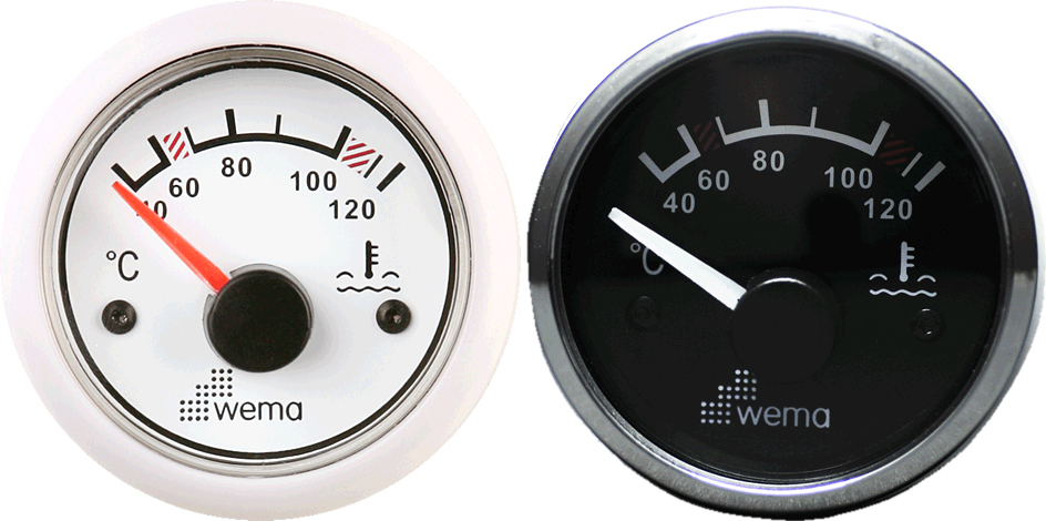Overvåk motorens kjølesystem med Wema Vanntemperaturmåler. Robust, vanntett (IP56) og resistent mot saltvann. Viser 0-120°C. Passer i standard 52mm instrumentpanel.